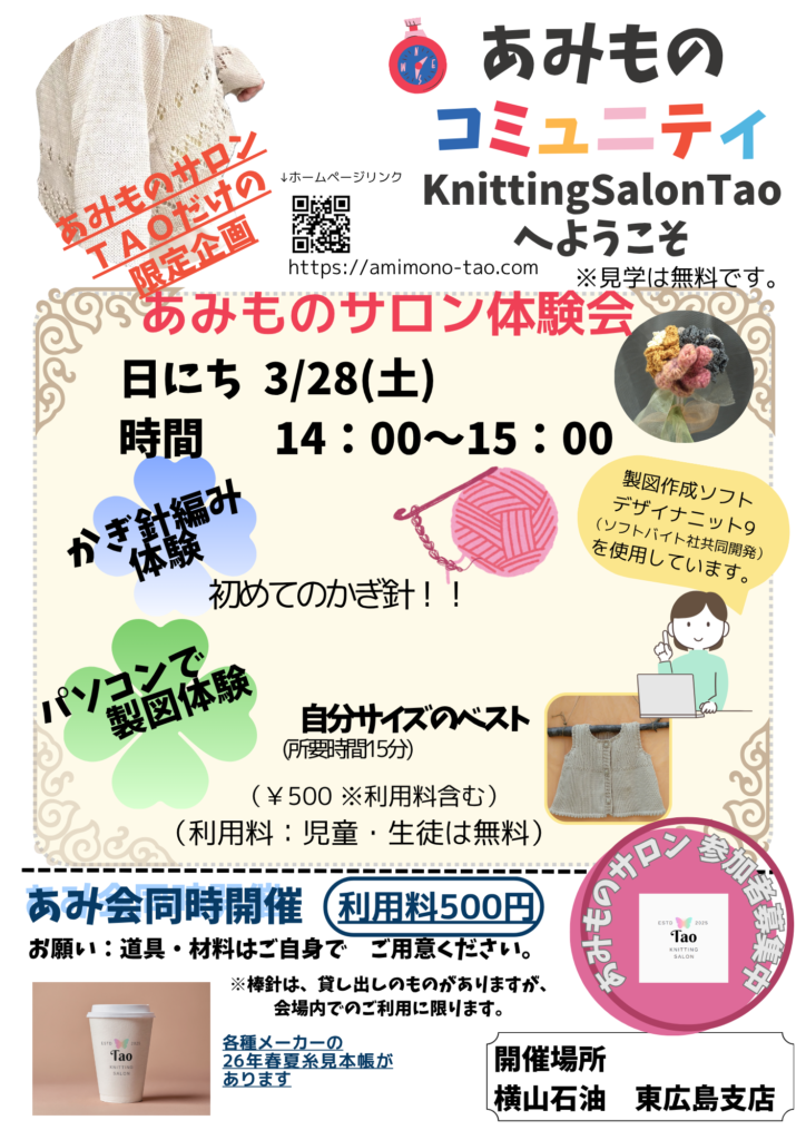 お詫び 2026.03.27 現在、メール機能が使えないためご不便をおかけいたしております。 (セキュリティー強化後に、メール機能の設定見直しを行っております。) 参加申し込み方法の変更 3/28のあみものイベントは、当日会場で参加申し込みを受付けます。